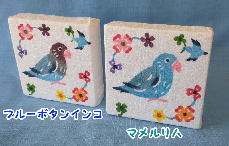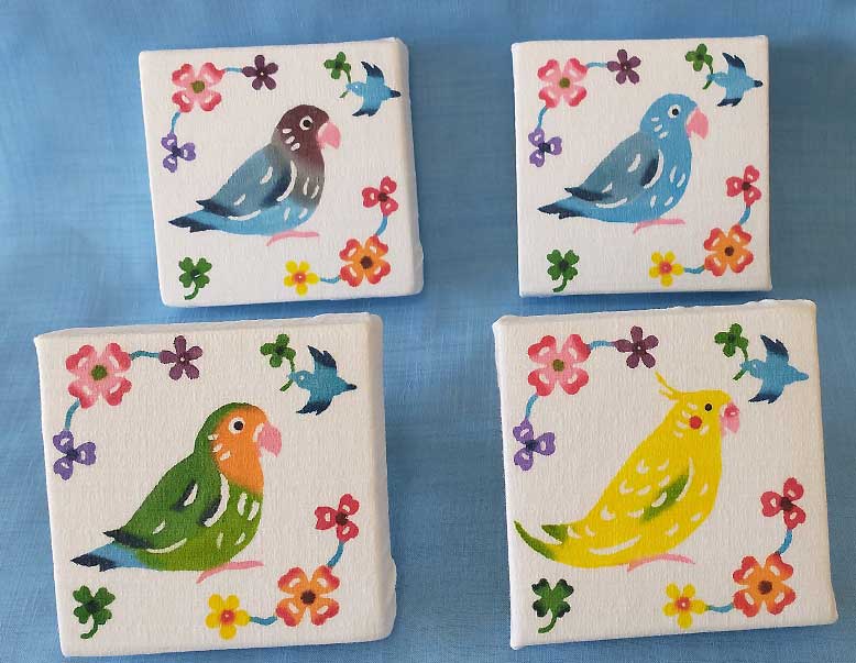 柄はコザクラインコ、オカメインコ、ブルーボタンインコ、マメルリハインコの4つのうちから4つ、お好きな柄を選択してください。